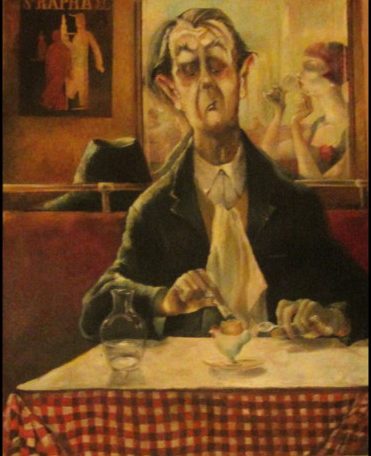 In a busy brasserie, a shy old man sits in a quiet corner avoiding the one of his pretty table-mate opposite him, reflected in the mirror. OIL, KNIFE TECHNIQUE.