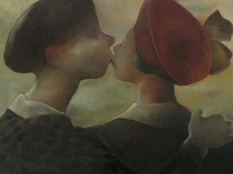 In a restaurant, 2 people meet.....their eyes exchange sient promises, while a bright tulip, symbol of a fragile love, looms between them. OIL 80X120